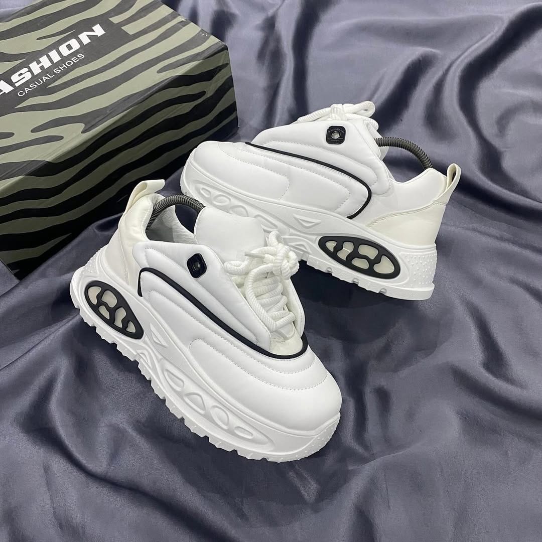 – Design: Chunky white sneakers with black and gray accents.